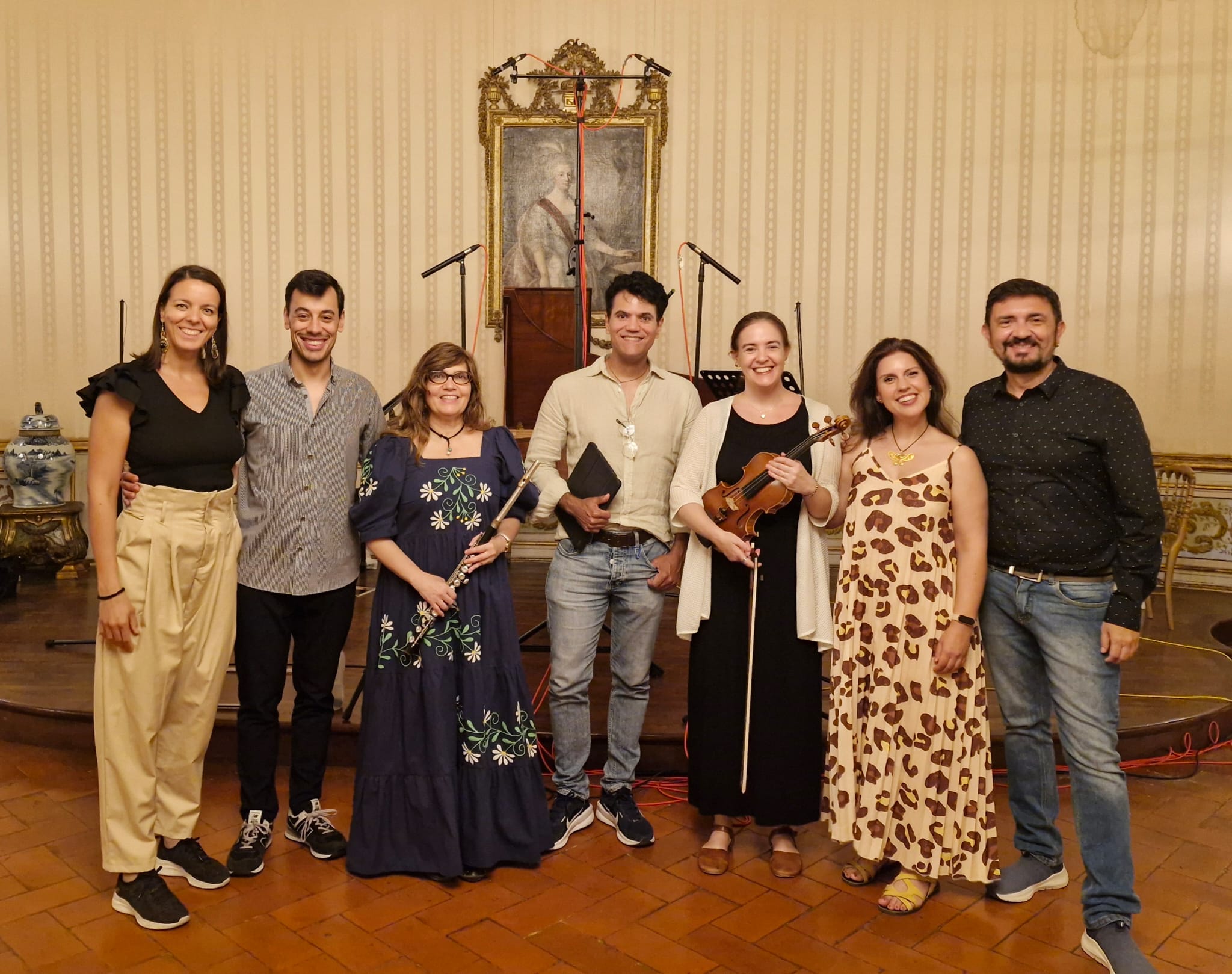 Neta de Ana Rosa Naves, a pianista e flautista Andréa Teixeira continua brilhando em sua bela trajetória musical. Na foto, com a equipe que interpreta o “Jornal de Modinhas: inéditos”, recomendado pelo exigente Global Music Awards