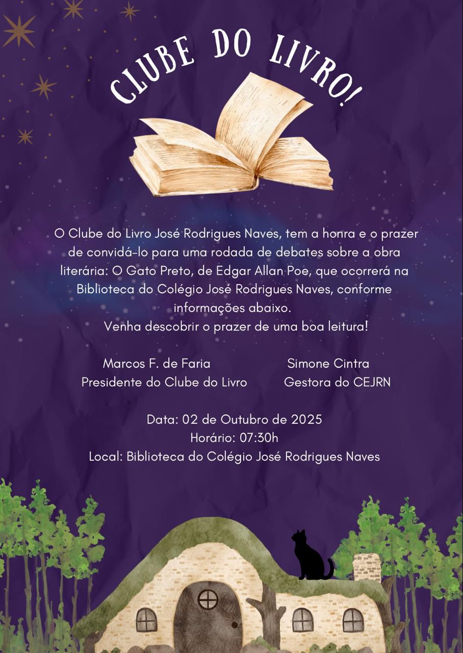 O Clube do Livro José Rodrigues Naves, criado em março deste ano em Goianira, é o primeiro da cidade, está abrigado no Colégio Estadual José Rodrigues Naves, a primeira escola de nível médio da antiga Vila de São Geraldo, e vai promover a sua segunda rodada de debates. No próximo dia 2 de outubro, às 7h30, na Biblioteca do Colégio, será realizada a discussão sobre a obra “O Gato Preto”, do escritor Edgar Allan Poe, crítico literário e editor norte-americano, um dos mestres do terror e do suspense e um dos criadores da ficção policial.