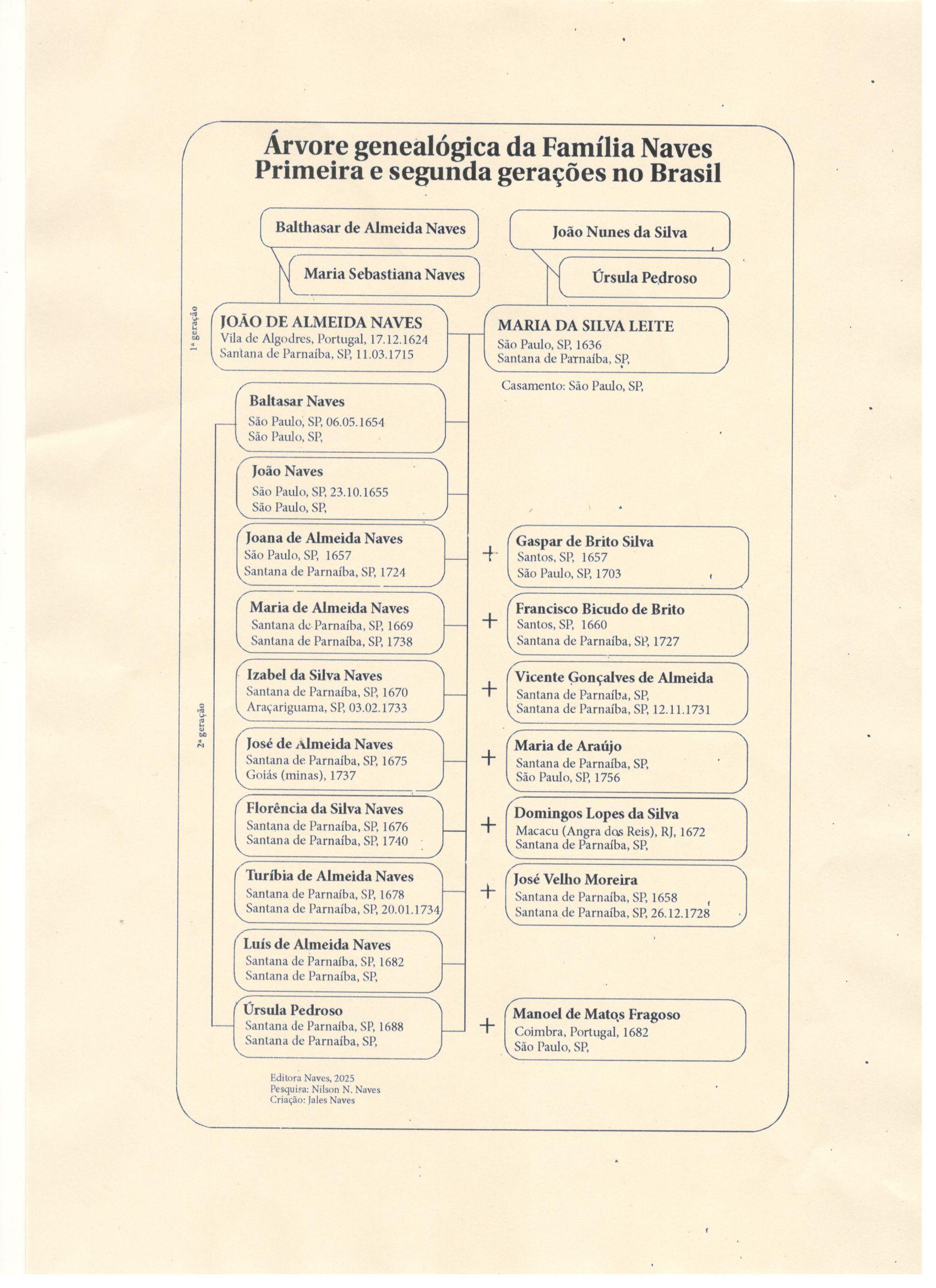 A Editora Naves produziu para seu pronunciamento gráficos com as 11 gerações desse período, começando pelos pioneiros João de Almeida Naves e Maria da Silva Leite, mencionando as datas e os documentos já localizados; quando ainda não há um registro oficial, cita como uma data possível. Dentre esses, o registro de batismo do João, em 17 de dezembro de 1624, na igreja de Algodres, Serra da Estrela, bispado de Viseu, em Portugal, filho de Balthasar de Almeida Naves e Maria Sebastiana Naves.